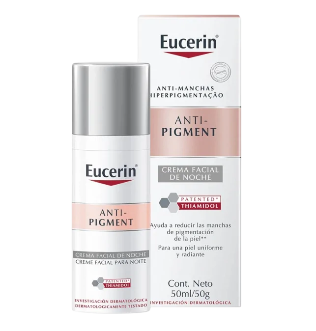 ¿Para que sirve Eucerin Anti-Pigment Crema Facial Noche? EUCERIN ANTI-PIGMENT Crema Facial Noche está indicada para el tratamiento de la hiperpigmentación en la piel. Su fórmula contiene Thiamidol, un ingrediente patentado que actúa directamente sobre la causa principal de las manchas al reducir la producción de melanina, ayudando así a disminuir visiblemente las manchas existentes y prevenir su reaparición. Además, contiene dexpantenol, un activo que favorece la regeneración celular durante la noche, contribuyendo a una piel más uniforme, luminosa y saludable. Es apta para todo tipo de piel y se recomienda su uso como parte de la rutina nocturna de cuidado facial.