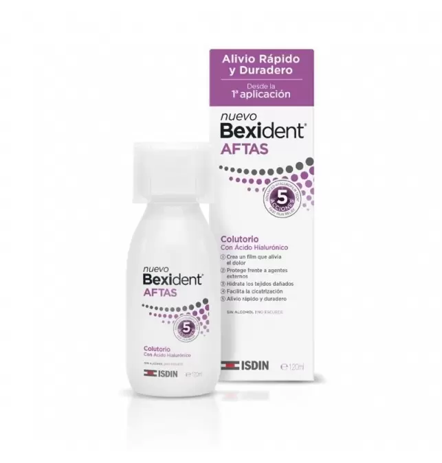 Bexident Aftas Colutorio es una solución bucal avanzada diseñada específicamente para el tratamiento de aftas, llagas bucales y pequeñas heridas causadas por ortodoncia o prótesis. Gracias a su exclusiva tecnología Advanced Hyalurofilm Tech, que combina ácido hialurónico con una película protectora, este producto proporciona un alivio inmediato y duradero del dolor desde la primera aplicación. Su fórmula actúa creando una barrera física que protege la lesión de agentes externos, reduce la inflamación y acelera significativamente el proceso natural de cicatrización de los tejidos. Al ser un colutorio, es ideal para tratar aftas múltiples o de difícil acceso en toda la cavidad oral.
