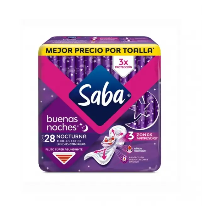 Las Toallas Sanitarias Saba Nocturna Largas Con Alas, en paquete de 28 piezas, están diseñadas para ofrecer máxima protección durante la noche, adaptándose a los movimientos del cuerpo para evitar fugas. Estas toallas tienen una superficie suave y canales de distribución que ayudan a dirigir el flujo más efectivamente, mientras que las alas proporcionan una mejor fijación a la ropa interior, asegurando confort y seguridad durante toda la noche. Su tecnología de absorción permite manejar flujos intensos, manteniendo la piel seca y cómoda.