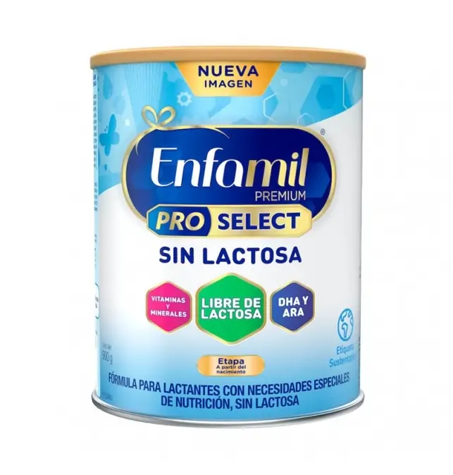 ¿Para qué sirve Enfamil Premium Pro Select Sin Lactosa 900 g? Enfamil Premium Pro Select Sin Lactosa 900 g es una fórmula especialmente diseñada para bebés desde recién nacidos que no toleran la lactosa. Es una opción pensada para quienes tienen necesidades especiales de nutrición relacionadas con molestias digestivas o intolerancia. Contiene nutrientes clave para el desarrollo saludable del bebé, como DHA y ARA (grasas buenas para el cerebro y la vista), Zinc, Hierro, Colina, además de vitaminas y minerales esenciales. Aunque la leche materna siempre es la mejor opción, esta fórmula puede ser una alternativa útil cuando no se puede dar pecho o el bebé presenta intolerancia a la lactosa.