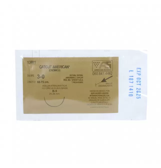 SUTURA ESTERIL ABSORBIBLE 3-0 DE LONGITUD 68-75 cm. CON AGUJA ATRAUMÁTICA 1/2 CÍRCULO AHUSADA B-5 25-26 mm. MARCA CATGUT AMERICAN (CRÓMICO)
