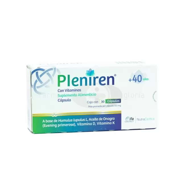 Pleniren es un suplemento alimenticio diseñado para mujeres, especialmente durante el climaterio y la menopausia, aunque también puede ser útil en situaciones de estrés metabólico o requerimientos nutricionales especiales. Contiene ingredientes como aceite de onagra, extracto de lúpulo (Humulus lupulus), y vitaminas D y K, que pueden ayudar a aliviar síntomas como bochornos, cambios de humor, nerviosismo y problemas de sueño.