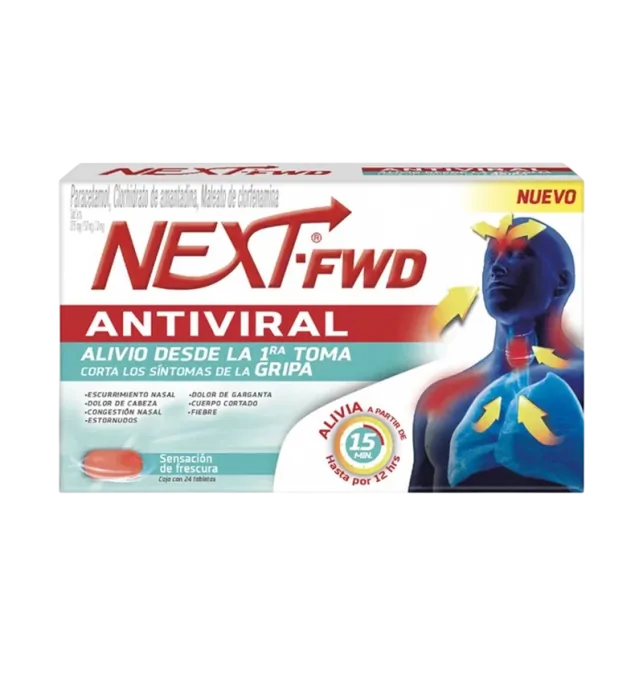 ¿Para que sirve NEXT-FWD? NEXT-FWD ANTIVIRAL está indicado para el alivio sintomático de la gripe y el resfriado común. Su fórmula combina paracetamol para reducir la fiebre y el dolor, amantadina como antiviral contra la influenza A, y clorfenamina para aliviar la congestión nasal y otros síntomas alérgicos asociados a estas afecciones. Este medicamento está diseñado para adultos y niños mayores de 12 años, proporcionando un alivio integral de los síntomas comunes de estas enfermedades virales.