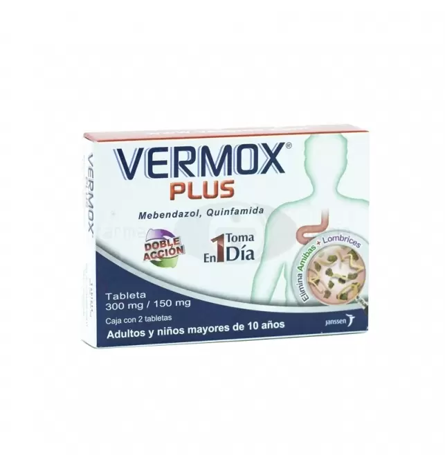 ¿Para qué sirve Vermox Plus 300Mg/150Mg Caja Con 2 Tabletas? Se utiliza para el tratamiento de infecciones intestinales por parásitos, ayudando a eliminar lombrices y otros parásitos comunes del intestino.