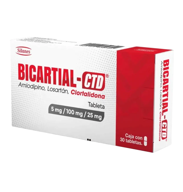 ¿Para que sirve Bicartial-CTD? BICARTIAL-CTD 5/100/25 mg es un medicamento de combinación fija que contiene losartán potásico (un antihipertensivo del grupo de los ARA II), amlodipino (un bloqueador de los canales de calcio) y clortalidona (un diurético tipo tiazida). Está indicado para el tratamiento de la hipertensión arterial en pacientes cuya presión no se controla adecuadamente con la combinación de solo amlodipino y losartán. Esta triple combinación permite un mejor control de la presión arterial al actuar por distintos mecanismos para reducirla.