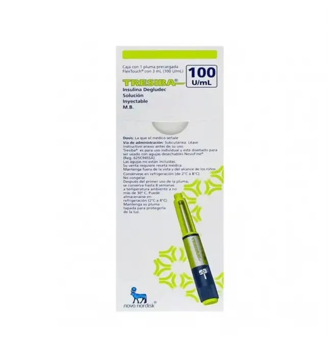 ¿Para que sirve Tresiba 100 U/ML Solución Inyectable 1 Pluma 3 ML? TRESIBA 100 U/mL solución inyectable está indicado para el tratamiento de la diabetes mellitus tipo 1 y tipo 2 en adultos, adolescentes y niños a partir de 1 año de edad. Se trata de una insulina basal de acción ultra-prolongada, diseñada para administración subcutánea una vez al día, en cualquier momento del día, siempre manteniendo un horario regular de aplicación.