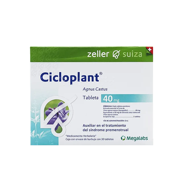 ¿Para qué sirve Cicloplant 40 mg 30 tabletas? Este producto a base de Agni casti fructus (Vitex agnus castus) está recomendado para aliviar los síntomas asociados al síndrome premenstrual, como la hinchazón, la tensión dolorosa en los senos y la irritabilidad que puede aparecer en esos días. Su acción ayuda a mejorar el bienestar general y a reducir las molestias físicas y emocionales relacionadas con el ciclo.
