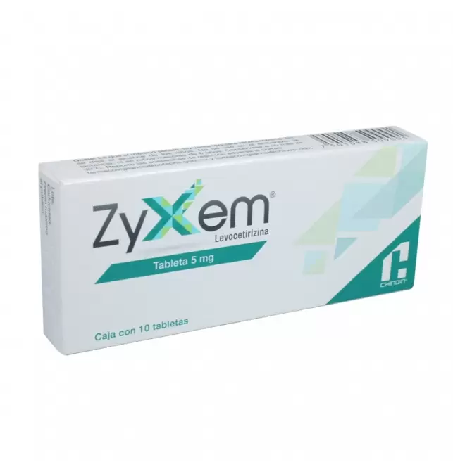 ¿Para que sirve Zyxem? Zyxem es un antihistamínico ideal para aliviar los síntomas de la rinitis alérgica (inflamación nasal por alergias), tanto estacional (alergias por temporada) como perenne (alergias durante todo el año), y la urticaria (ronchas en la piel). Este medicamento es efectivo para reducir la congestión nasal, estornudos, picazón y otros síntomas alérgicos, proporcionando un alivio rápido y duradero.